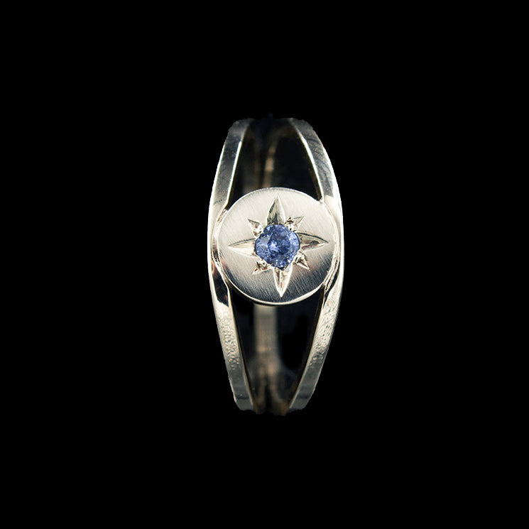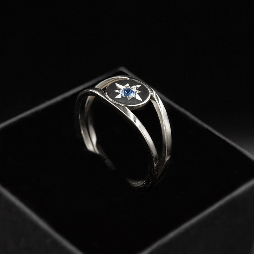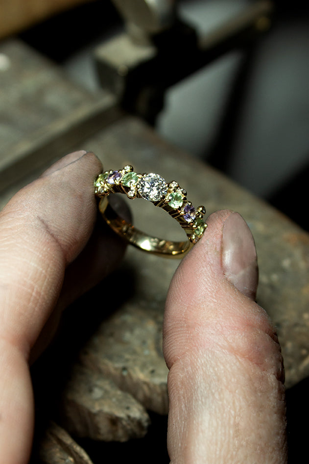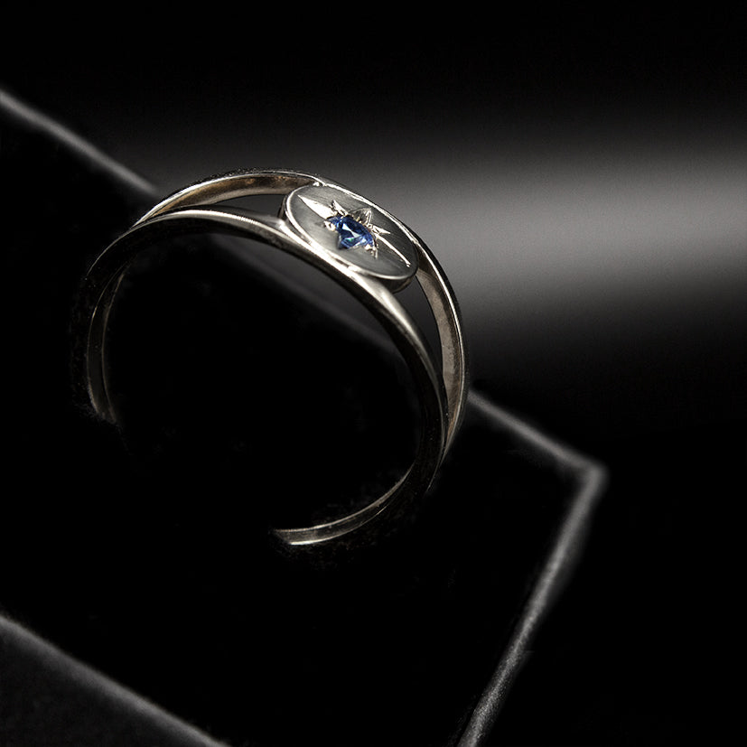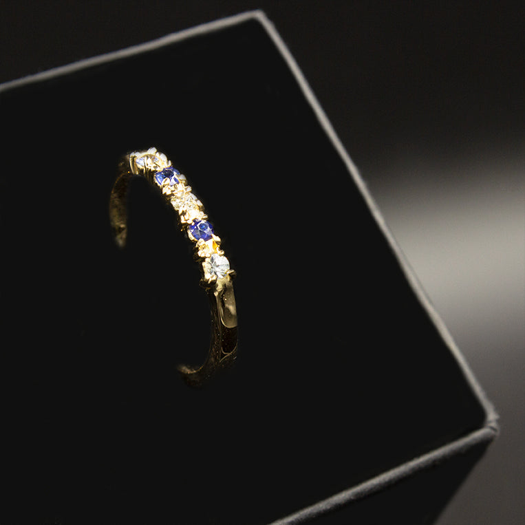 - Le diamant central de 5 mm, sélectionné avec attention pour sa pureté et son éclat, est délicatement entouré de saphirs et de diamants, apportant une belle profondeur à l’ensemble.